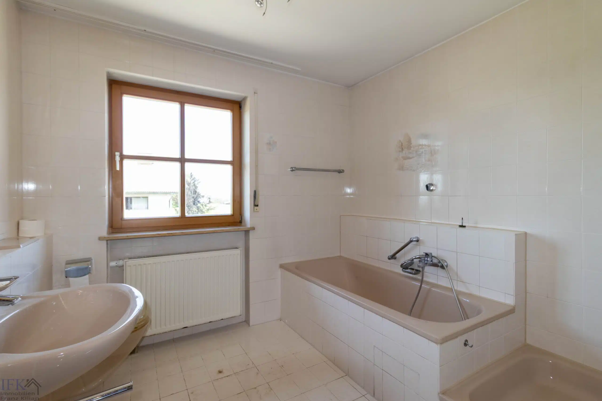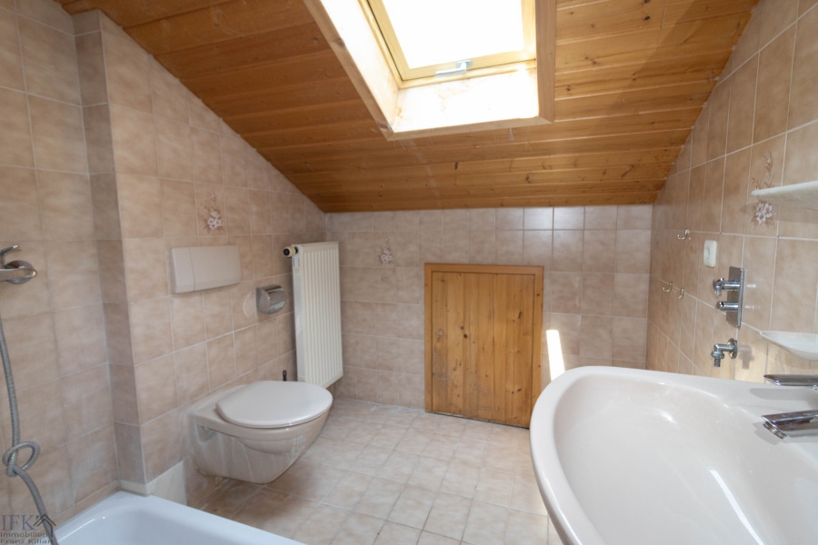 Das großzügige Tageslichtbad verfügt über Badewanne, Dusche, WC sowie Waschtisch.