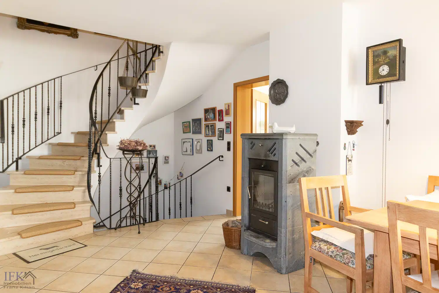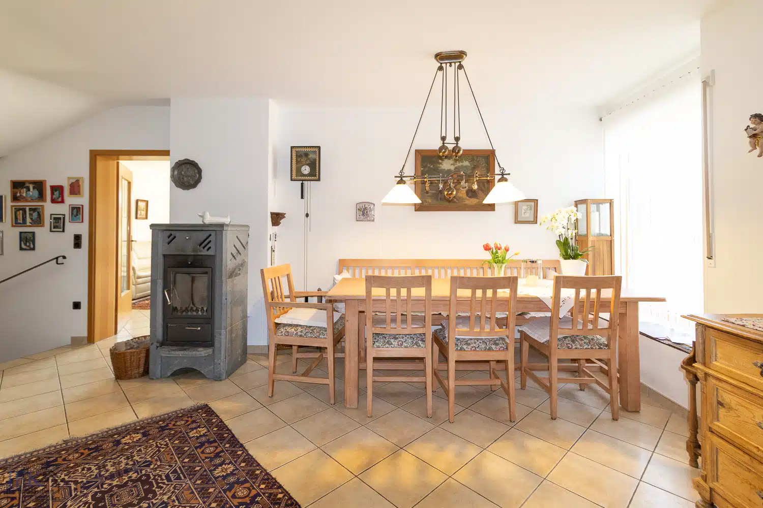 Von hier aus gelangen Sie in den großen, offenen Esszimmer-Bereich mit Kaminofen, in das angrenzende Gäste WC mit Vorraum samt Schreiner-Einbauschränken sowie in die Küche (Einbauküche mit Elektrogeräten ist im Kaufpreis enthalten).