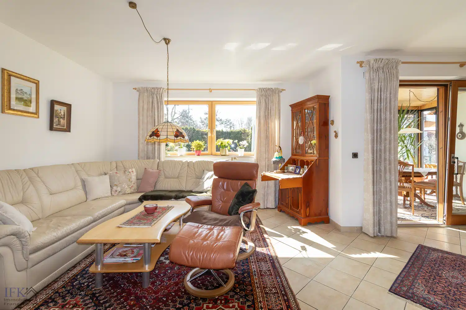 Vom Esszimmer gelangen Sie in das große Wohnzimmer welches ebenfalls über einen Kaminofen verfügt. Ein angebauter Wintergarten sowie eine sonnige Süd-West-Terrasse runden diese Räumlichkeit neben großzügigen Fensterflächen mit attraktiven Lichteinfall ab.