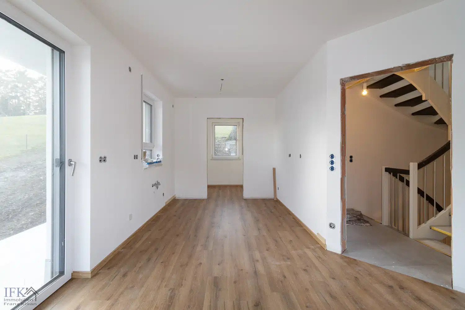 Über eine Harfentreppe aus Buchenholz gelangen Sie in das 1. Obergeschoss in den Wohnbereich.