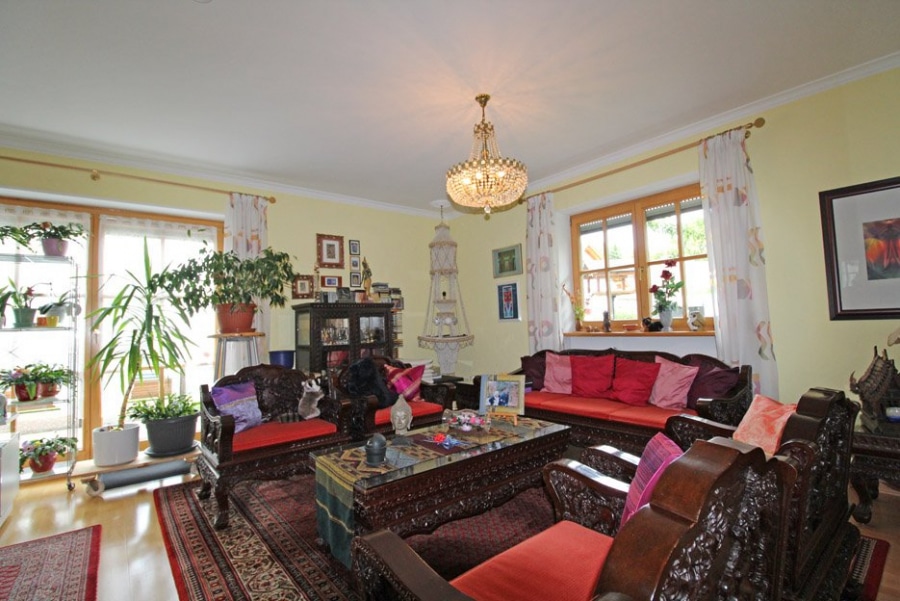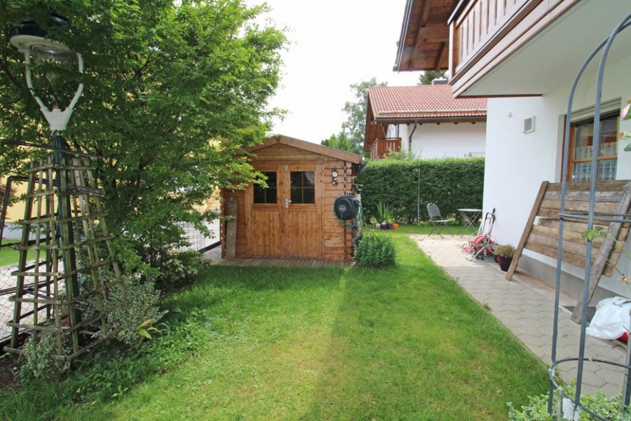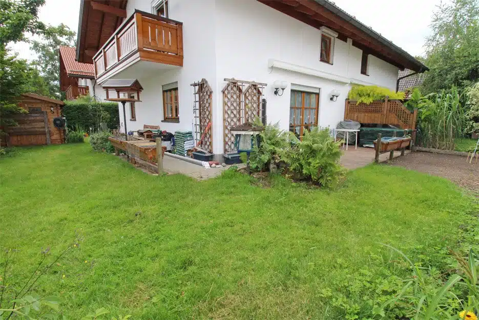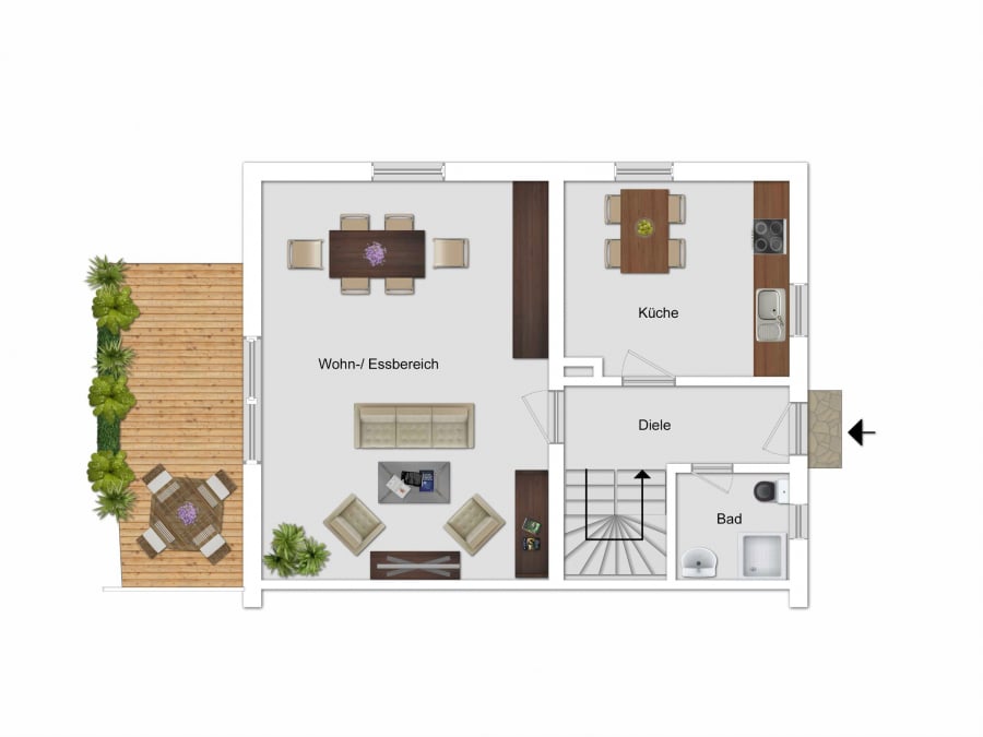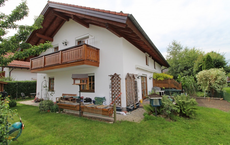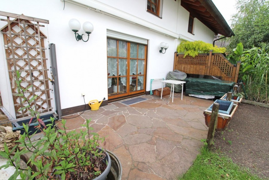 Die an das Wohnzimmer angrenzende Terrasse führt Sie in den gemütlichen Garten mit Westausrichtung.