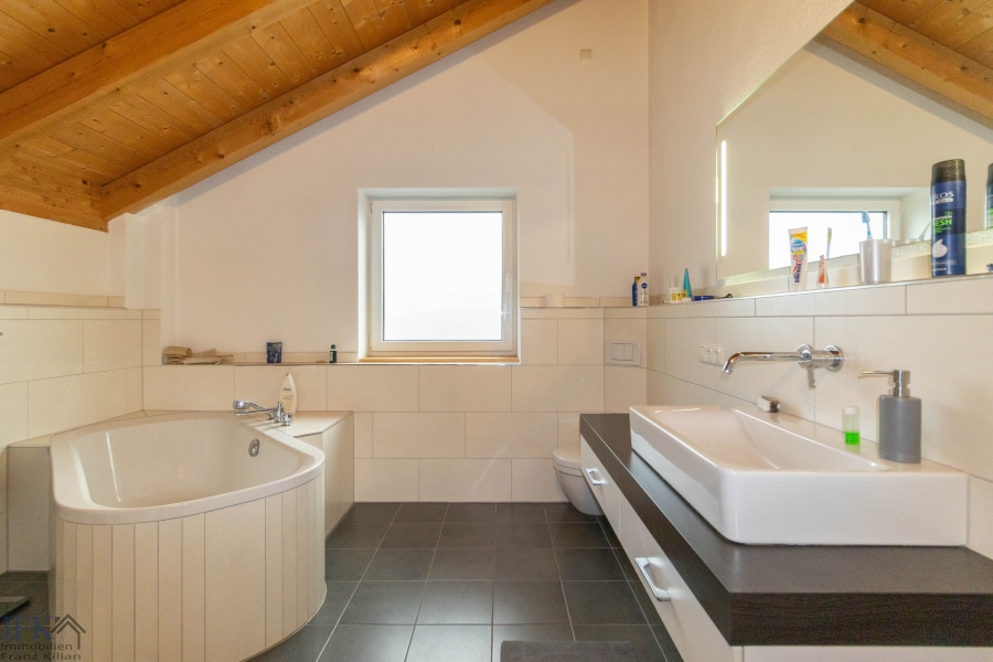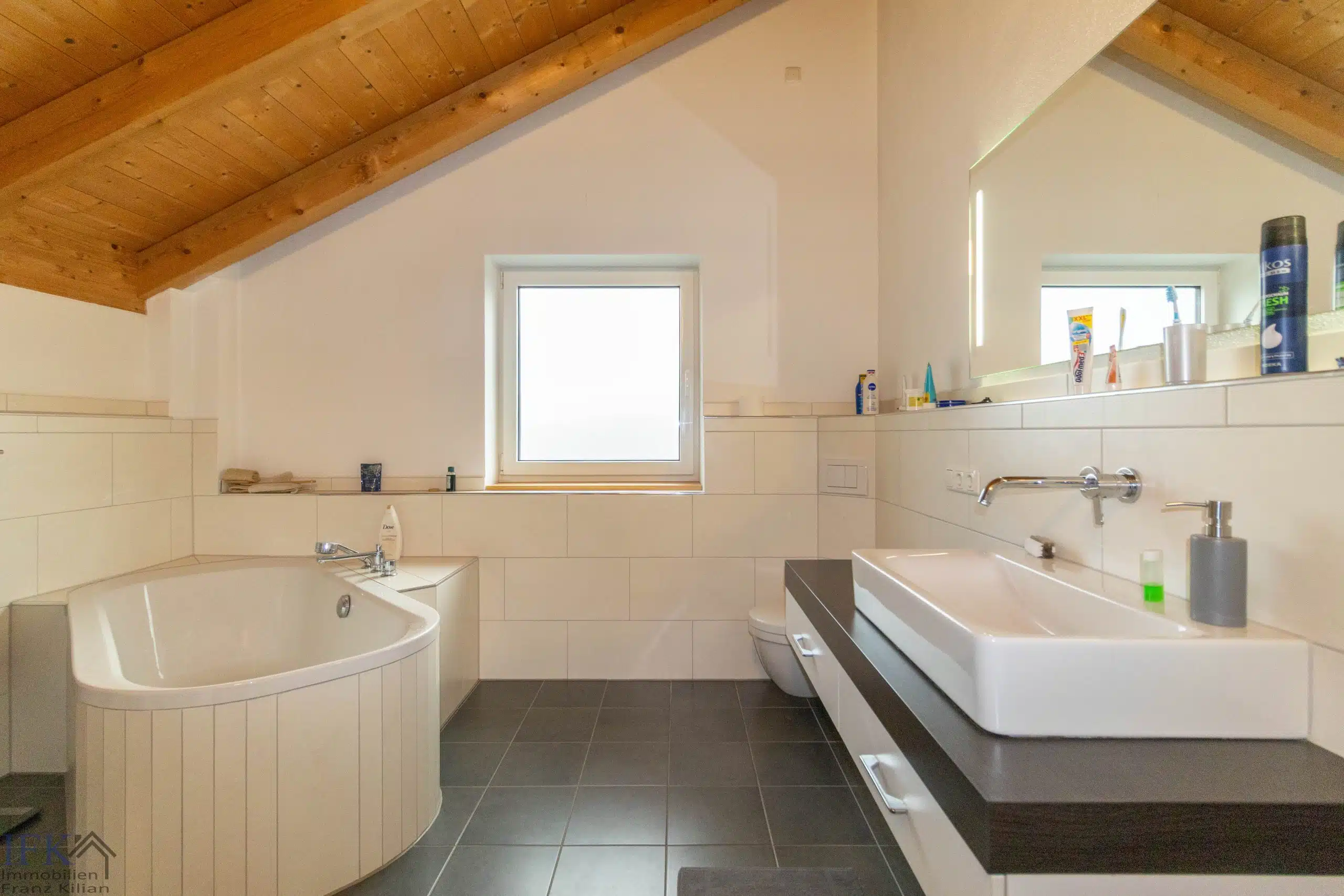Zudem befindet sich im Obergeschoß das vollausgestattete Badezimmer mit bodengleicher XXL-Dusche, WC, Waschtisch sowie Badewanne. Ein großes Schlafzimmer sowie ein Kinderzimmer runden diese Etage ab. Traumhaft hohe Decken mit Sichtdachstuhl sorgen für eine tolle Raumatmosphäre.