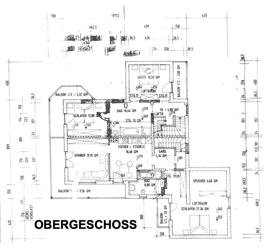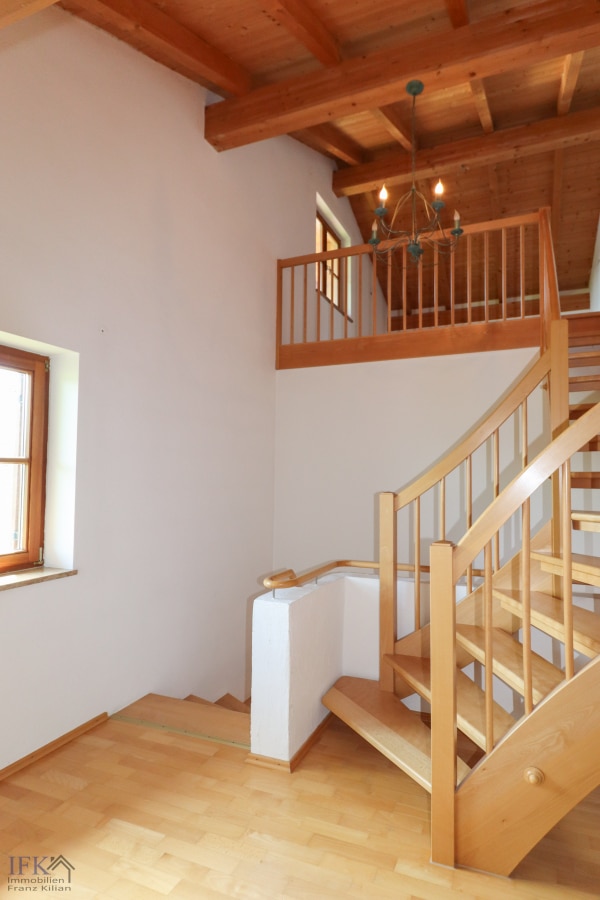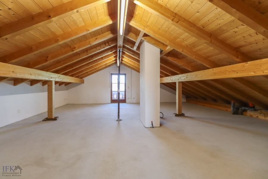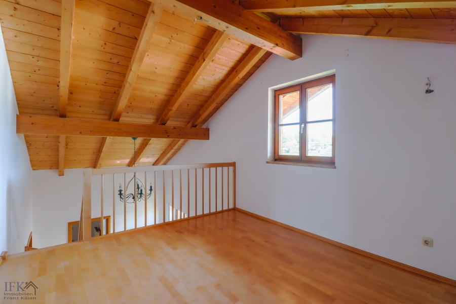 Im Obergeschoß befinden sich zwei Schlafzimmer (jeweils mit Balkon) sowie ein großes, voll ausgestattetes Badezimmer. Über eine gefällige Holztreppe gelangen Sie ins Dachgeschoß und werden dort von einem Galeriezimmer empfangen. Zudem befindet sich hier ein ca. 85 Quadratmeter großer Speicher, welcher bereits zum Ausbau vorbereitet ist und ebenfalls über gute Belichtungsverhältnisse verfügt (dieser Raum sowie die Galerie sind in der Wohnflächenberechnung NICHT berücksichtigt!). Auch der Speicher verfügt über einen eigenen Balkon.