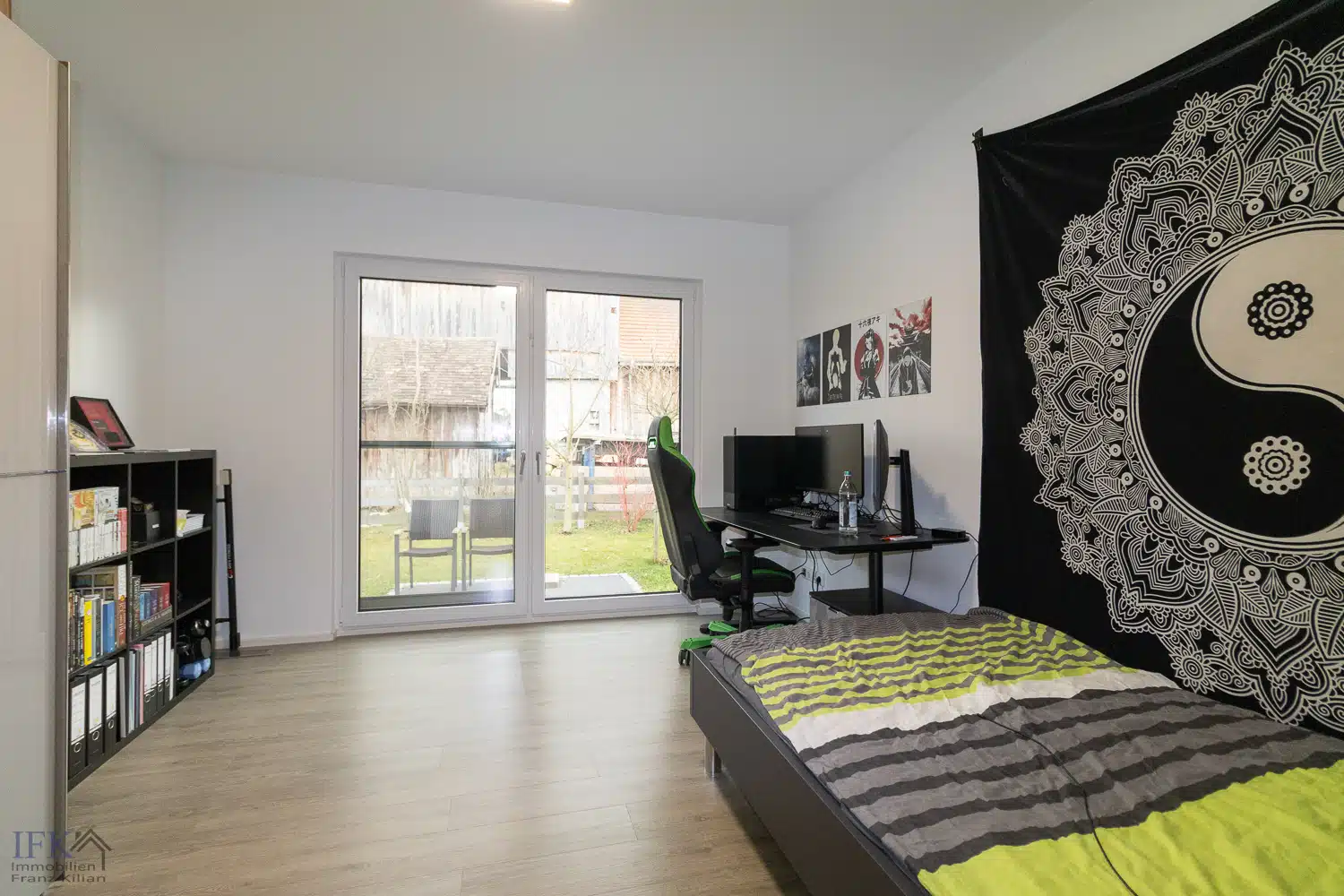 Die Einliegerwohnung im Erdgeschoß hat einen eigenen Eingang. Hier erwarten Sie ein großes Schlafzimmer, ein großzügiges Wohnzimmer mit integrierter Küche (Einbauküche im Kaufpreis enthalten) sowie ein Badezimmer mit bodengleicher Dusche, WC sowie Waschtisch.