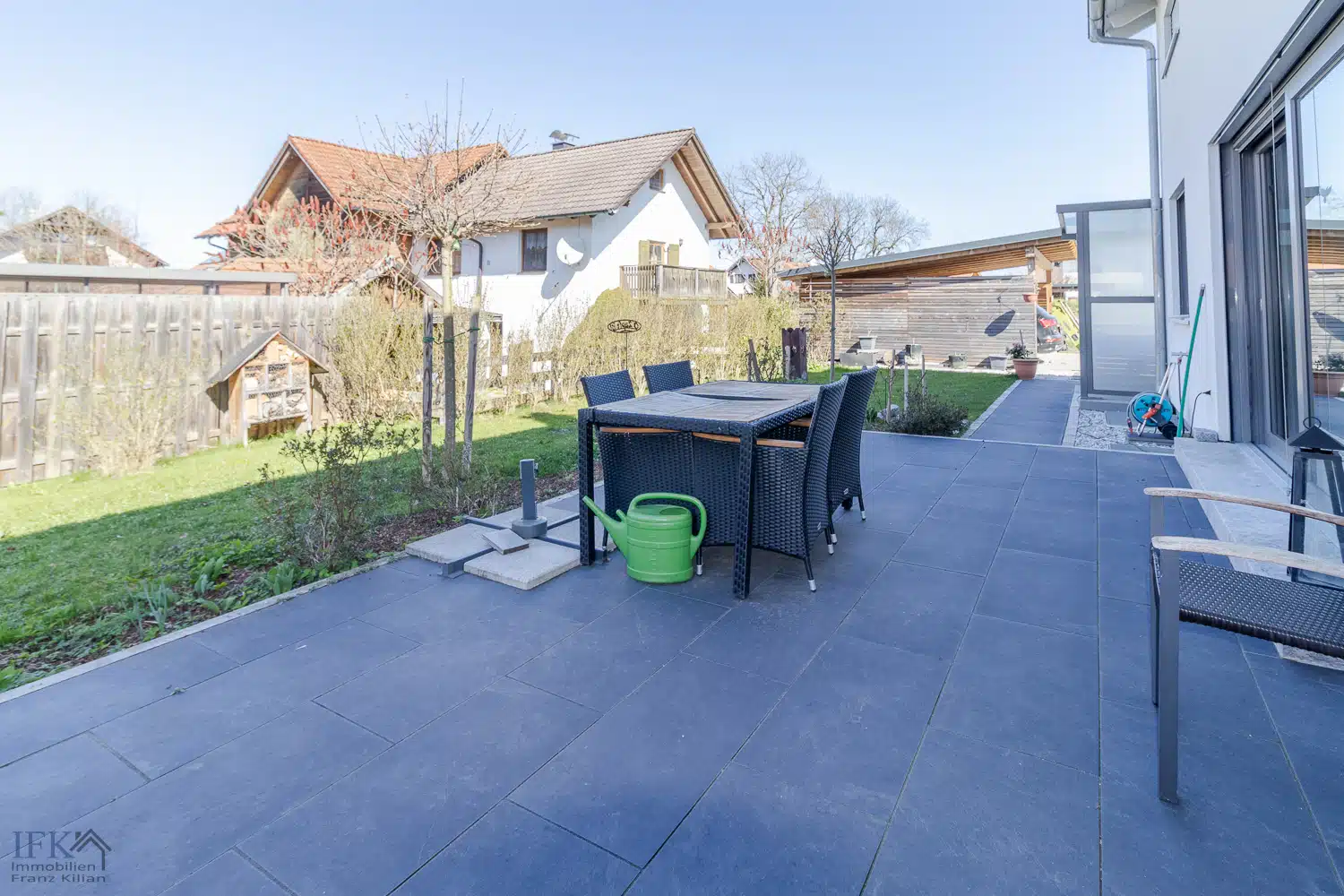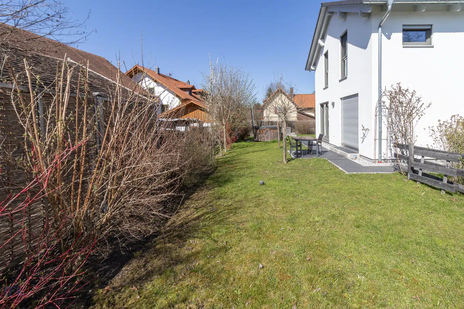 Dank großer, umlaufender Terrasse können Sie an schönen Tagen den eigenen Süd-West-Garten geniessen. Dieser ist charmant angelegt und lädt zum Entspannen ein.