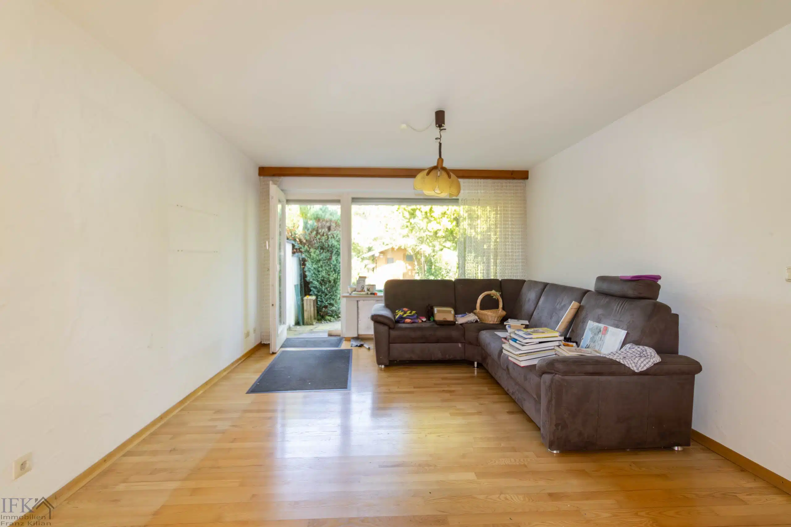 Vom Wohnzimmer gelangen Sie direkt auf die große Terrasse sowie in den sonnigen Garten mit West-Ausrichtung.