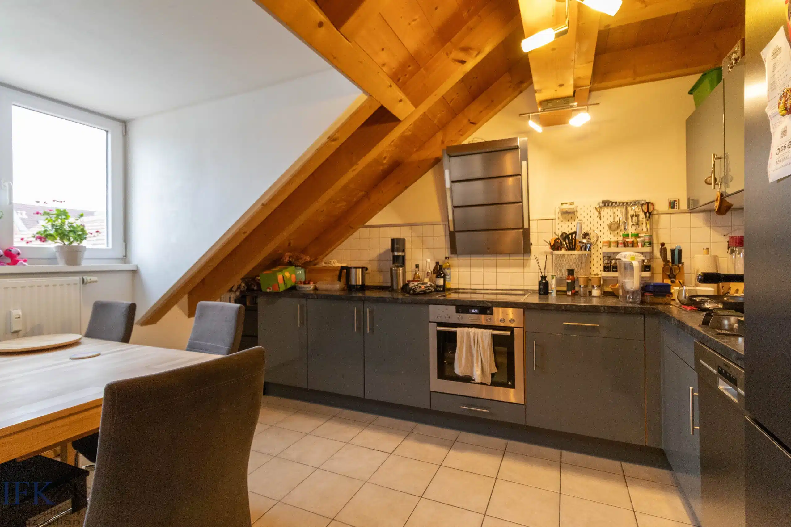 Das charmante Dachgeschoß empfängt Sie mit traumhaften Deckenhöhen und gefälligen, offenen Zimmermannsdachstuhl. Die hier beherbergte ca. 73 Quadratmeter große Wohnung verfügt über eine praktische Diele mit darüber liegendem Stauraum, einer Küche (Einbauküche samt Elektrogeräte sind im Kaufpreis enthalten), einem Badezimmer mit Badewanne, WC sowie Waschtisch, ein Schlafzimmer sowie ein großzügiges Wohn- Esszimmer mit Zugang zum sonnigen Südbalkon.