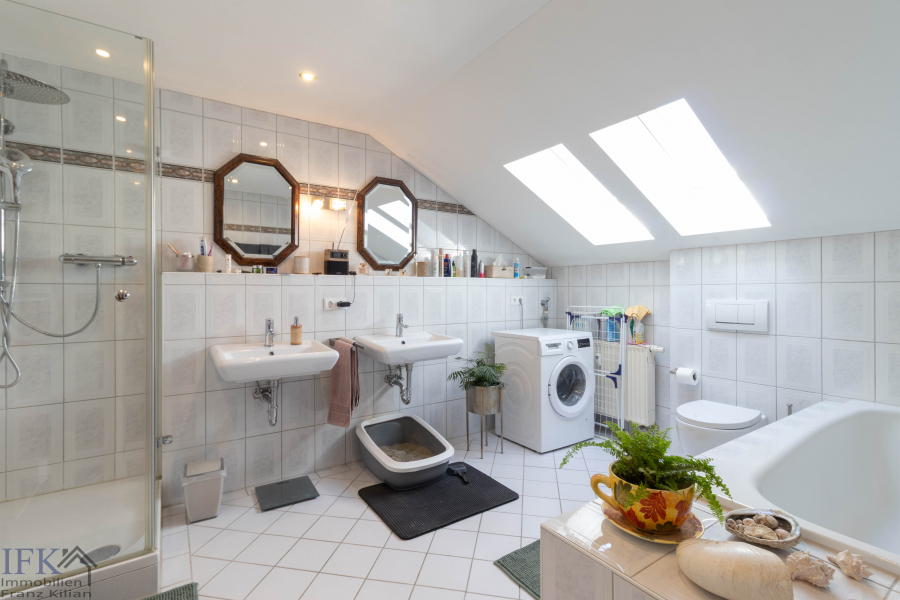 Ein weiteres, großes Badezimmer verfügt über eine Badewanne, eine Dusche, einen Doppelwaschtisch, ein WC, einen Waschmaschinenanschluss und ebenfalls gute Belichtung dank 2 Dachflächenfenster.