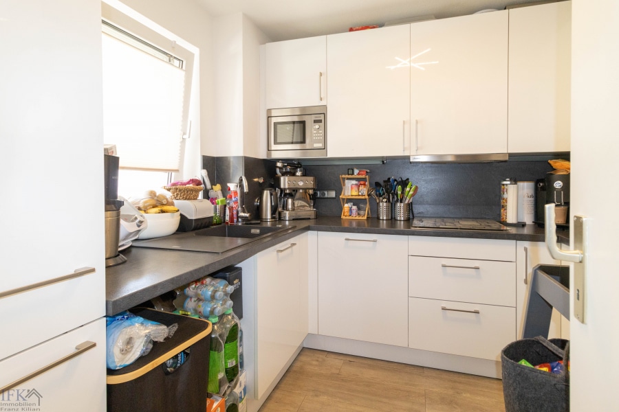 Die helle Küche verfügt über eine neuwertige Markeneinbauküche mit Hochglanzfronten und wertigen Geräten, welche bereits im Kaufpreis enthalten ist.