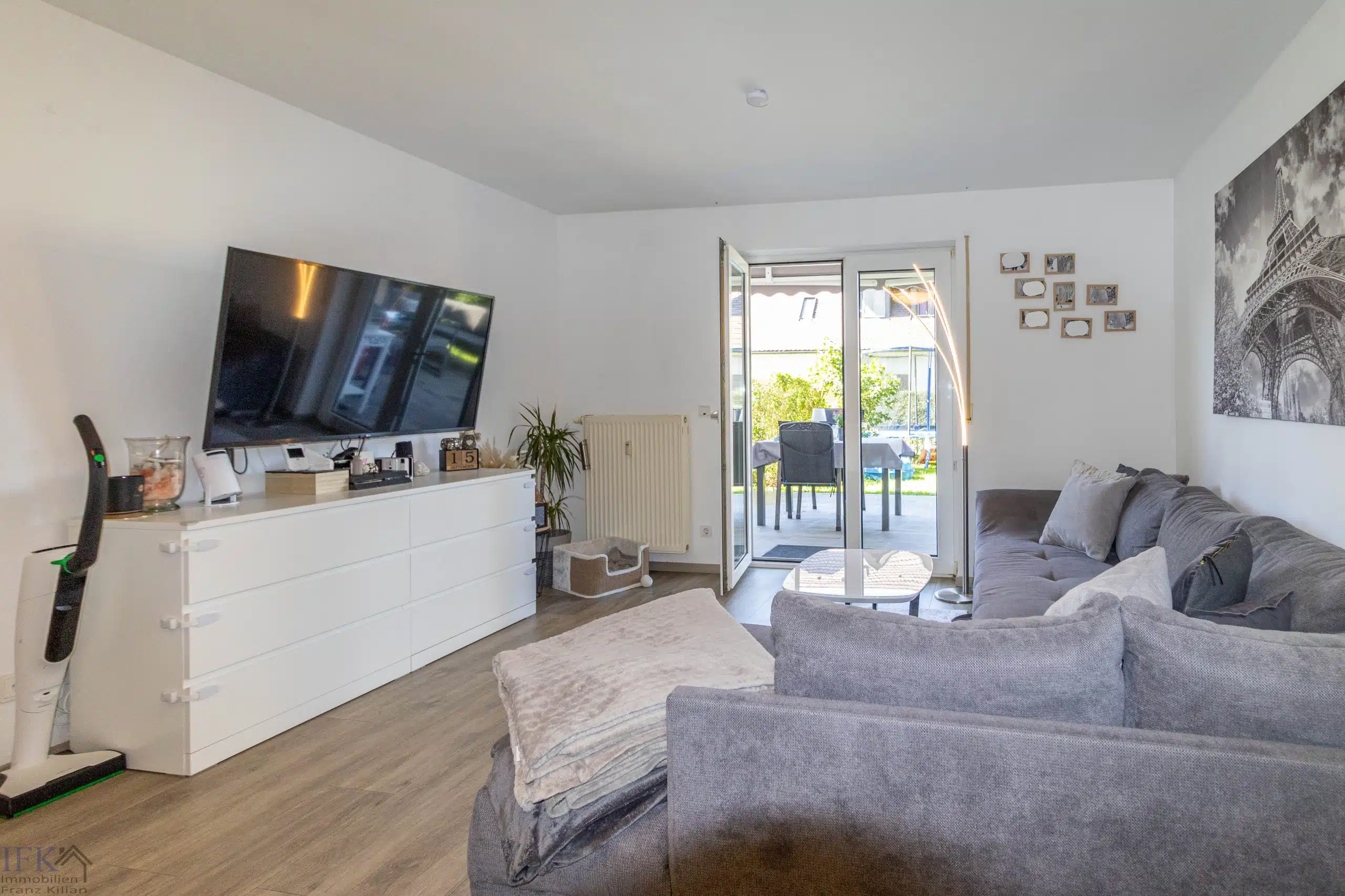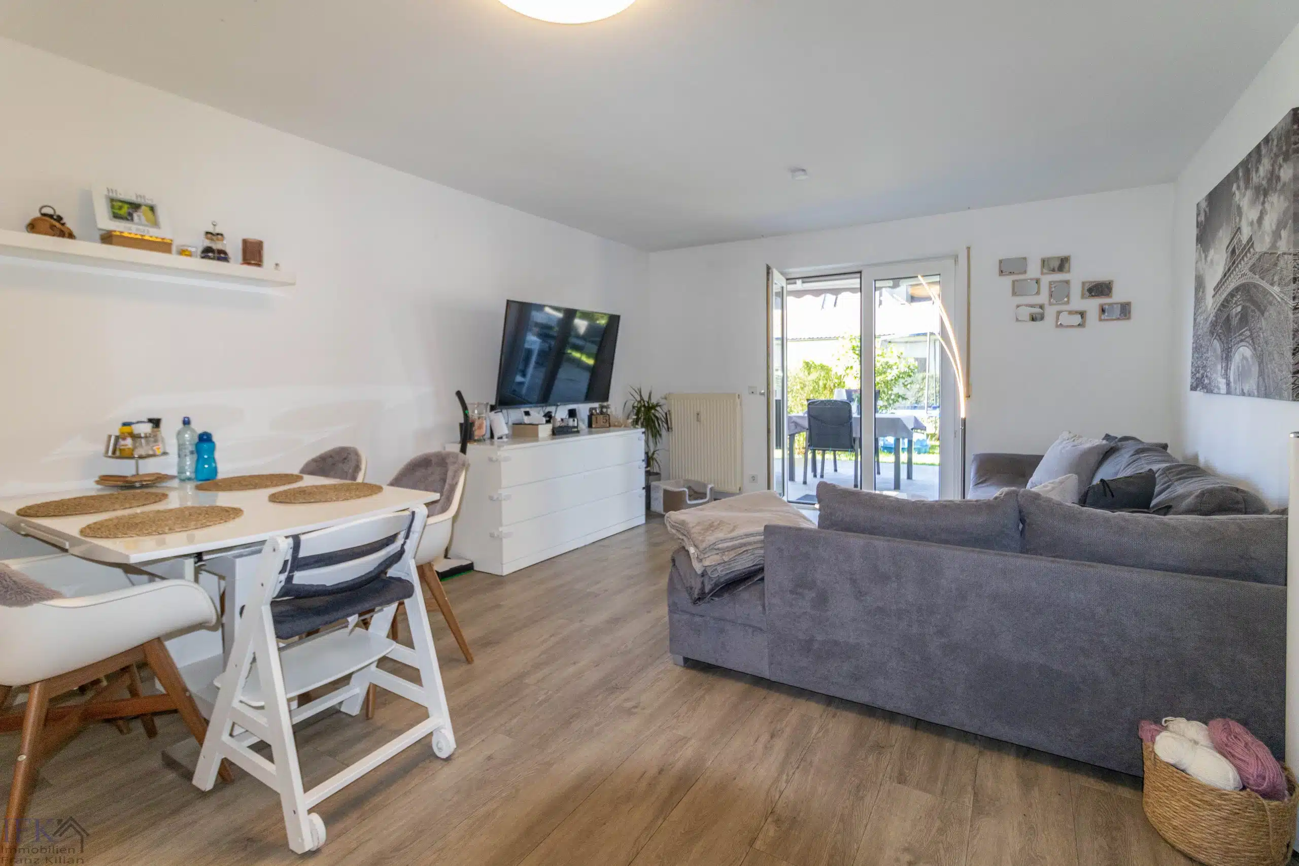 Der großzügige Wohn-Ess-Bereich lässt viel Freiraum für Möblierung und eröffnet den Zugang zur großen Terrasse sowie in den großzügigen Süd-West-Garten.