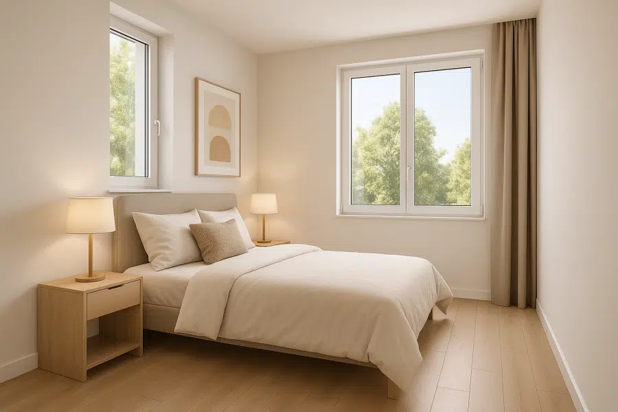 Bereits beim Betreten der Wohnung (Nr. 6) werden Sie die angenehme Belichtung wahrnehmen. Von der Diele aus haben Sie Zugang zum Schlafzimmer (ein Doppelbett wäre hier auch möglich), zum Badezimmer mit Waschtisch, WC, Waschmaschinenanschluss und bodengleicher Dusche. Platzsparende Schiebetüren sorgen für attraktive Stellmöglichkeiten für das Mobiliar.