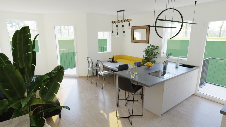 Auch im Inneren werden ausschließlich hochwertige Materialien verwendet. So verfügen die Wohnungen z.B. über Fenster mit 3-Fach-Verglasung, Fussbodenheizung, Vinylfußböden, elektrische Rollläden, Lüftungsanlage sowie hochwertige Sanitärausstattungen.