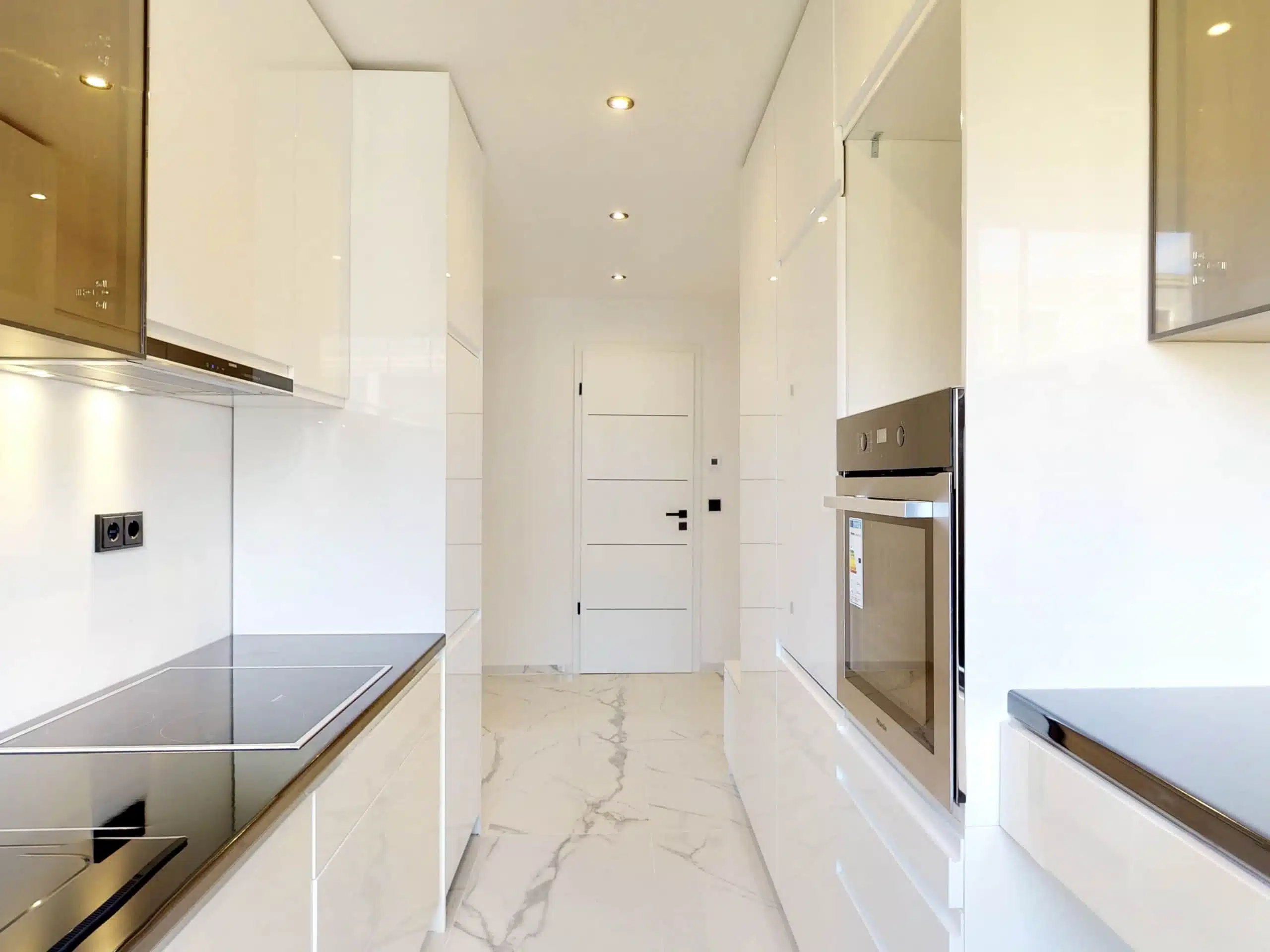 Die modern gestaltete und hochwertige Hochganz-Einbauküche samt Elektrogeräten lassen das Herz jeden Hobbykochs höher schlagen. Hier finden Sie ausreichend Stauraum, hochwertige Küchengeräte sowie praktische Arbeitsflächen in perfekt aufeinander abgestimmten Design.