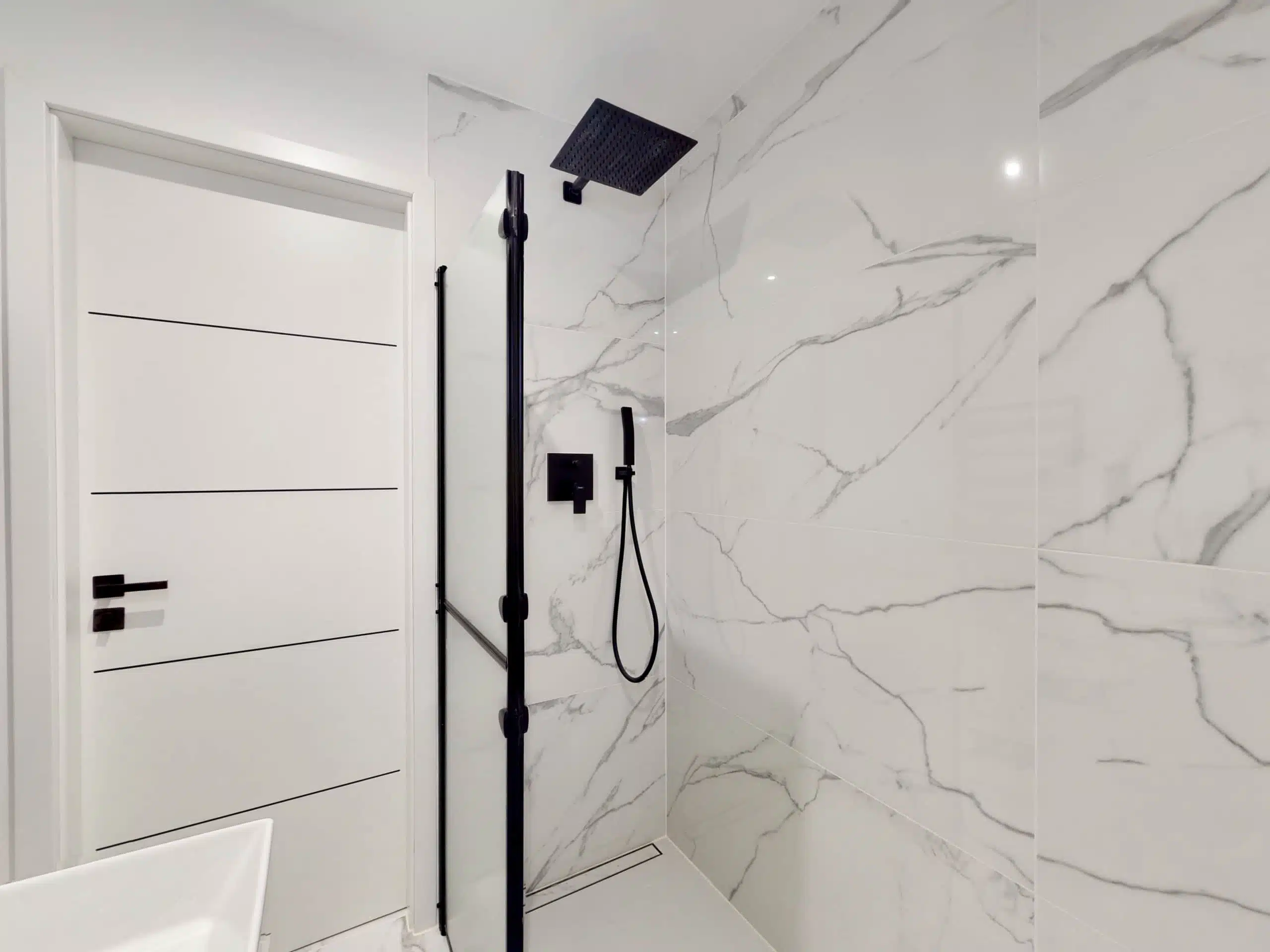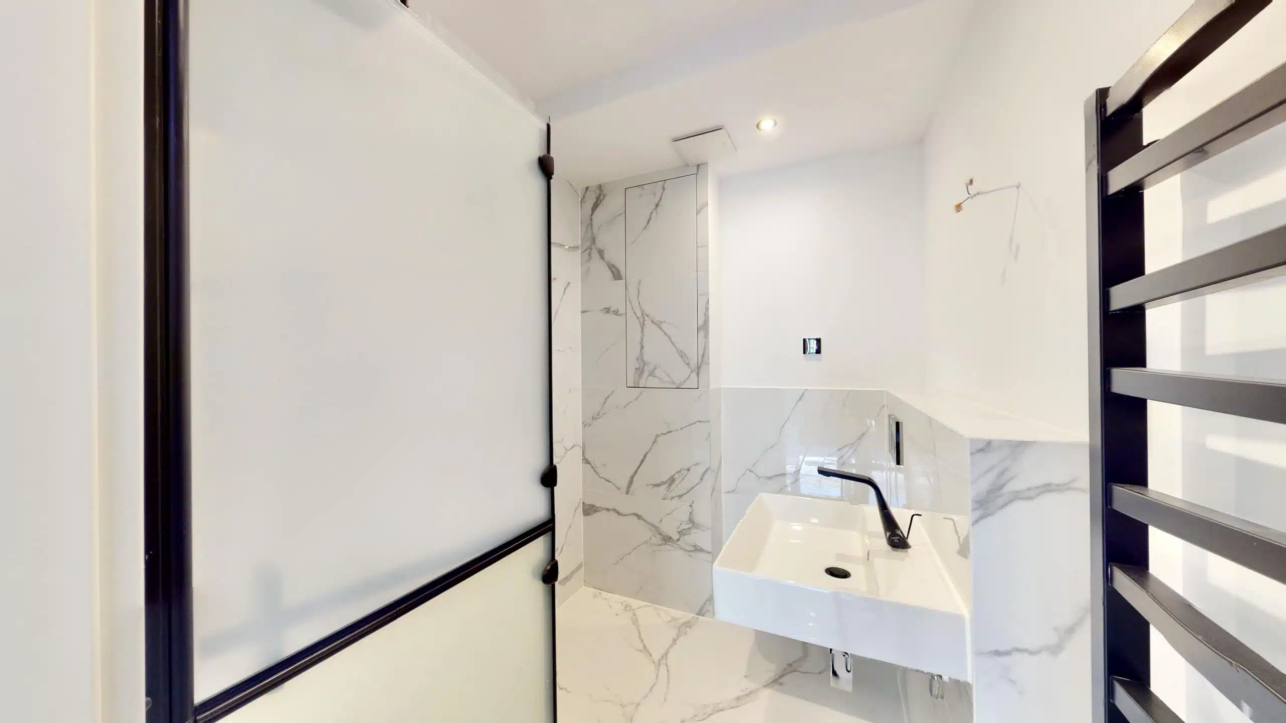 Von hier aus gelangen Sie in das modern gestaltete Luxus-Badezimmer. Dieses sorgt dank Tageslicht, großformatigen Marmor-Fliesen, modernen, schwarzen Design-Armaturen sowie einer großen Walk-In-Dusche mit Echtglas-Wand und der großem Rainshower-Dusche für eine wahre Wohlfühloase. Natürlich sind auch ein moderner Waschtisch sowie WC als auch ein schwarzer Handtuchwärmer vorhanden.