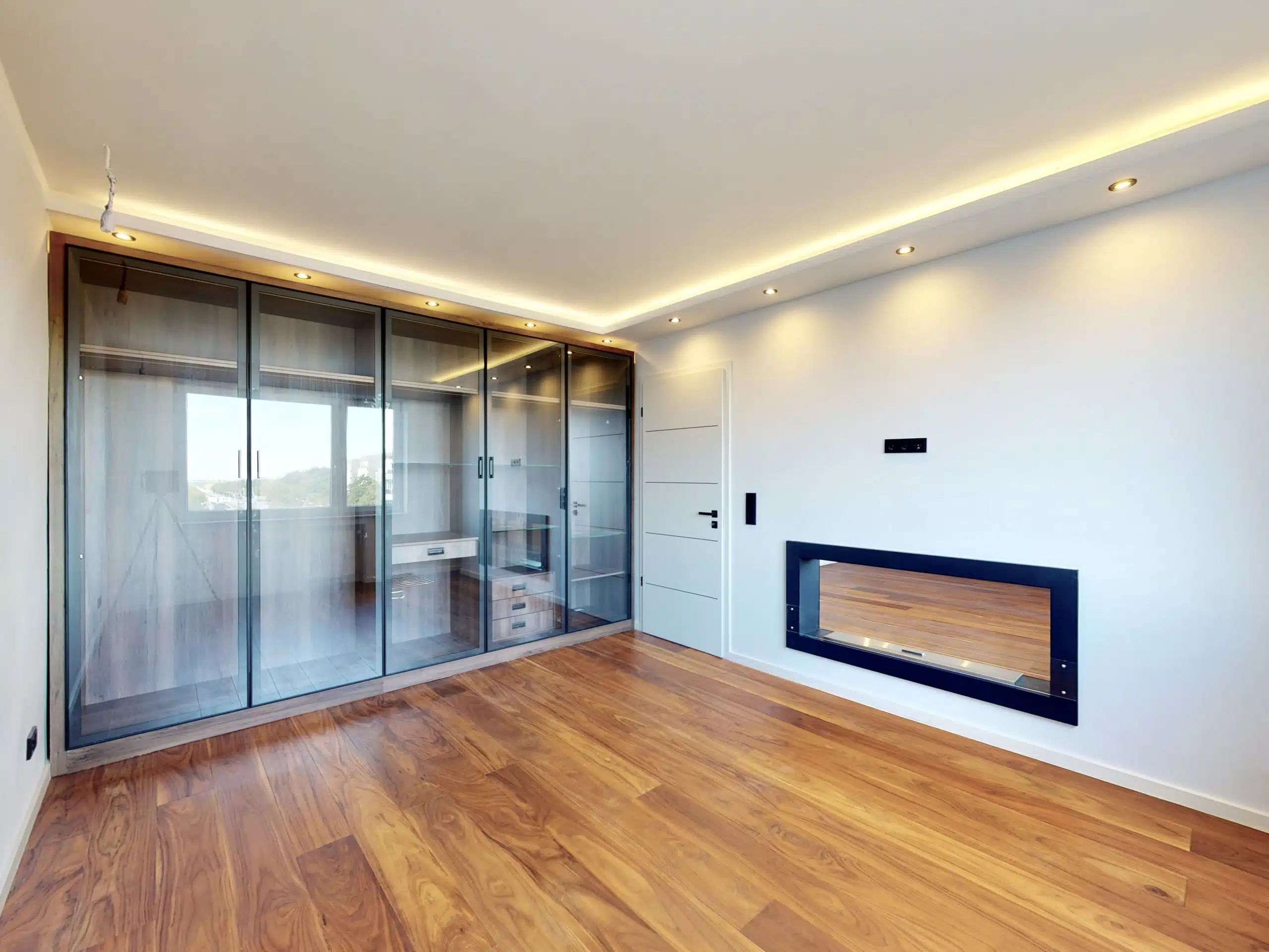 Das Schlafzimmer verfügt ebenfalls über Dielen-Parkett sowie Einbaustrahler und wird dank einem Designer-Kleiderschrank mit verglasten Türen perfektioniert.