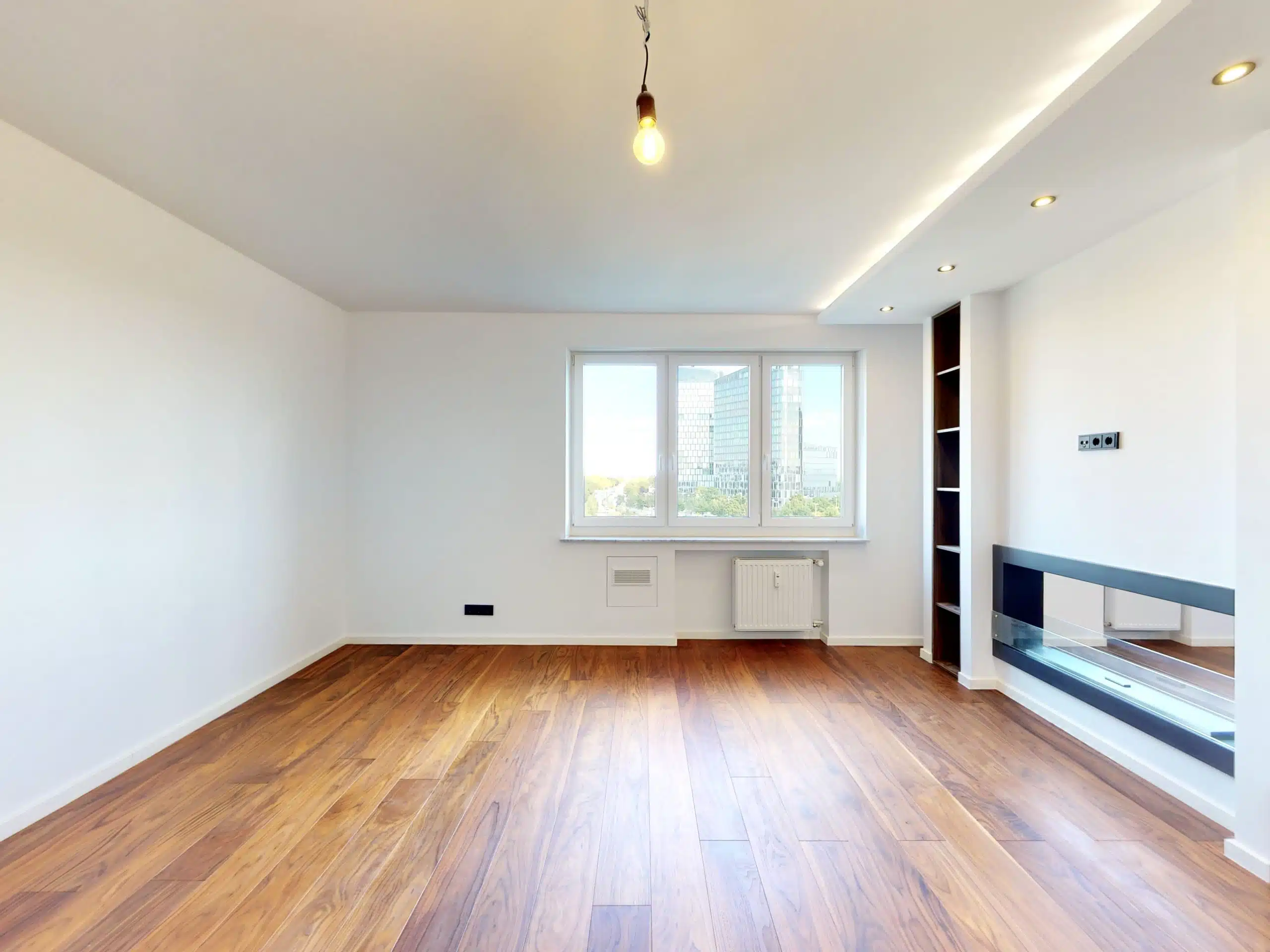 Das großzügige und dank großer Fensterflächen helle Wohnzimmer beschert Ihnen einen tollen unverbauten Ausblick über die Dächer Münchens sowie auf die Tower. Neben einem hochwertigen Parkett verfügt dieser Raum auch über geschickt platzierte Einbauspots.