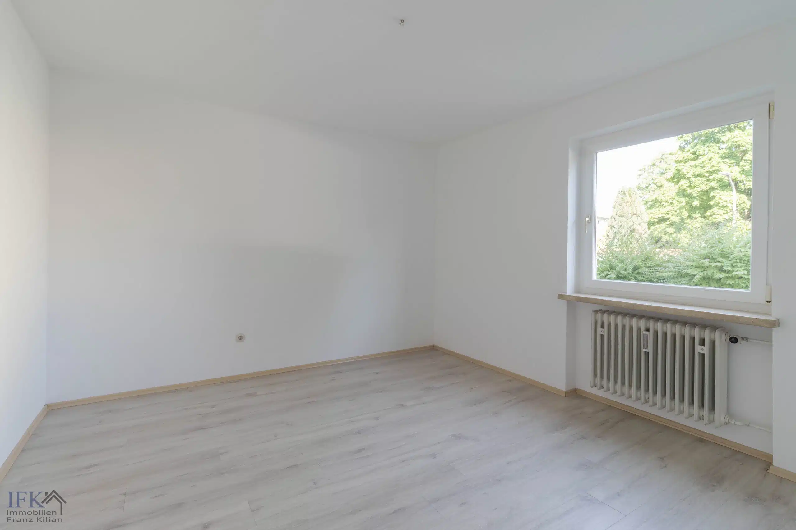 Die Wohnung selbst liegt im Hochparterre. Nach wenigen Stufen gibt die Eingangstüre den Zugang zur Diele frei. Von hier aus gelangen Sie in die separate Küche, in das Tageslichtbad mit Badewanne, WC, sowie Waschtisch und in die beiden geräumigen Schlafzimmer. Das sehr schön belichtete Wohnzimmer mit Panoramafenster bietet Zugang zum Süd-Balkon. Von hier aus können Sie den Blick ins Grüne in vollen Zügen genießen. Auch von einem der beiden Schlafzimmer können Sie den Balkon erreichen. Eine praktische Abstellnische bietet Platz für eine Garderobe oder Stauraum für alltägliche Dinge.