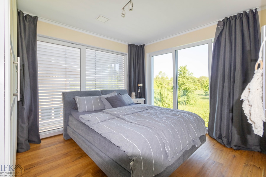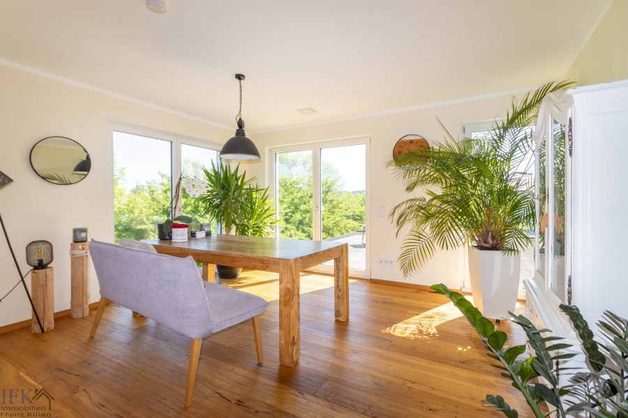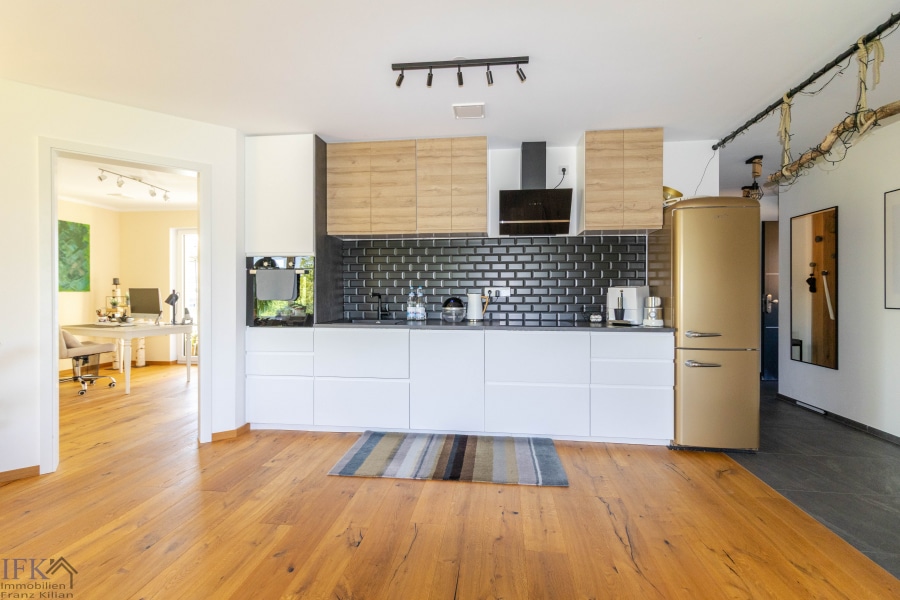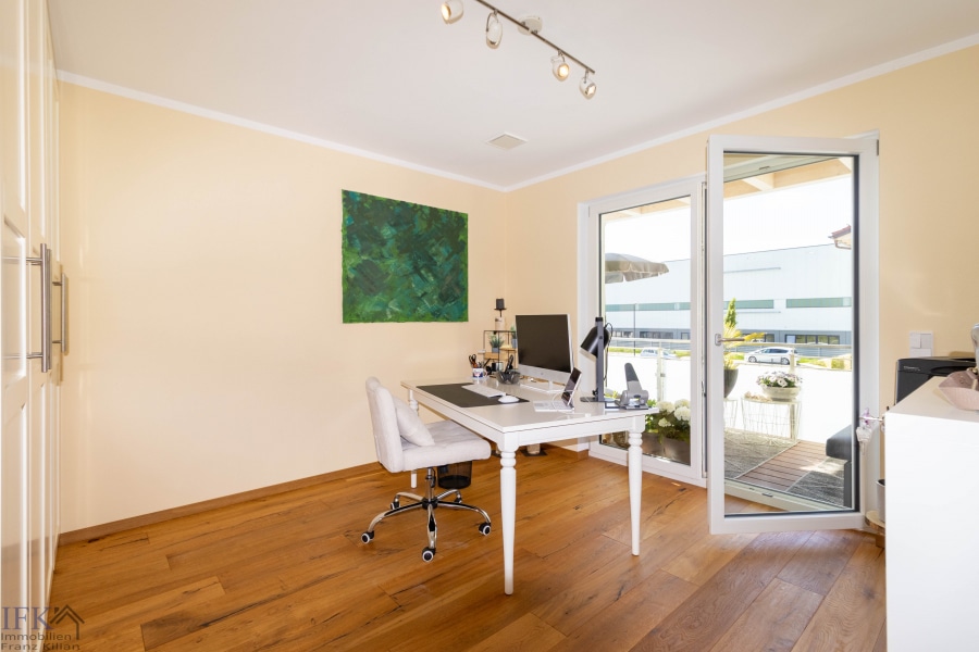 Im 1. OG befindet sich neben einem einladenden Wohn-/ Ess-/ Küchenbereich noch ein Büro und ein Schlafzimmer sowie ein hochwertig ausgestattetes Badezimmer und eine separate Toilette. Vom Büro aus haben Sie Zugang zum Südbalkon. Bodentiefe und große Fensterfronten sorgen für gute Belichtung und geben den Blick ins Grüne und einen naheliegenden Bachlauf frei.