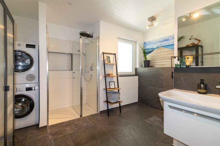 In allen Räumen befinden sich ausreichend Steckdosen und Netzwerkdosen. Die Bodenbeläge sind in hochwertigen, großformatigem Feinsteinzeug, sowie Dielenparkett ausgeführt. Die Sanitäreinrichtung kann als luxuriös betitelt werden.